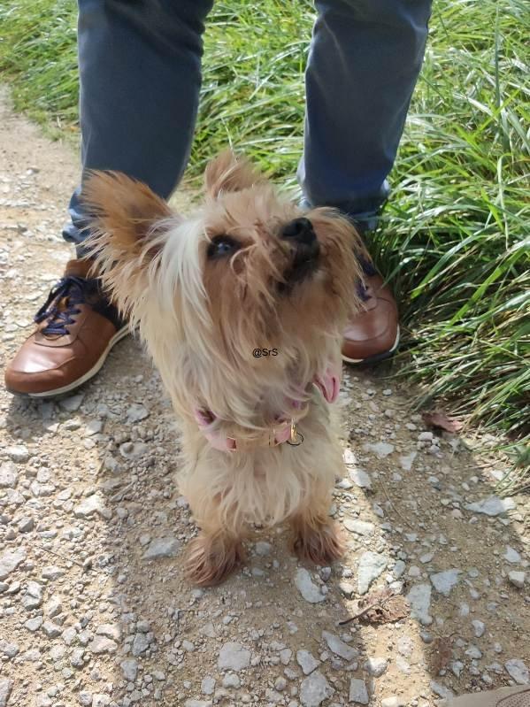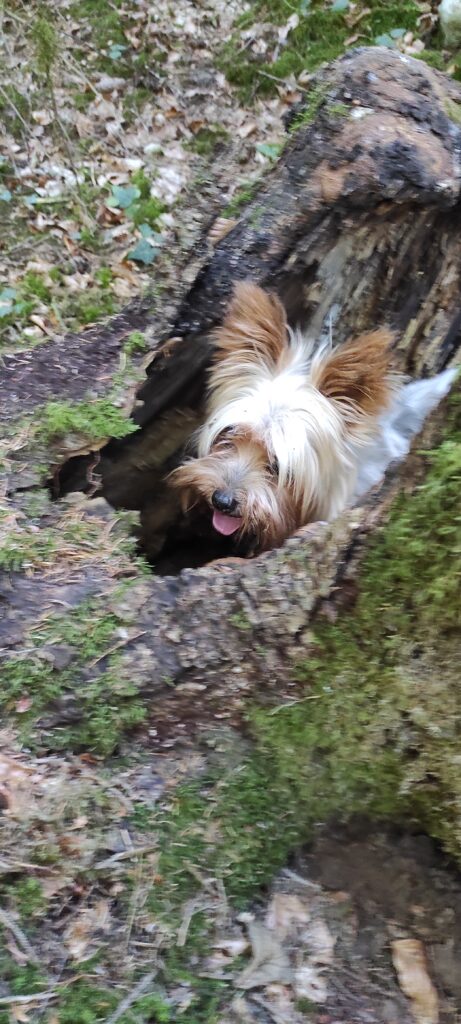 Gwendy est notre yorkshire, doyenne du quartier âgée de 12 ans depuis le 10 septembre dernier. Elle est de bonne compagnie avec les autres chiens de toutes tailles s’ils sont doux. Avant l’arrivée de Lola, son plaisir était d’aller distribuer ses balles à tous les chiens de la rue le soir venu. Maintenant la clôture est posée pour l’arrivée de Lola, c’est un gros changement pour elle. C’est une chasseuse de campagnol hors pair, quitte à s’user les dents sur les racines et cailloux, patiente, elle peut s’acharner sur sa proie pendant des heures.