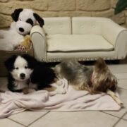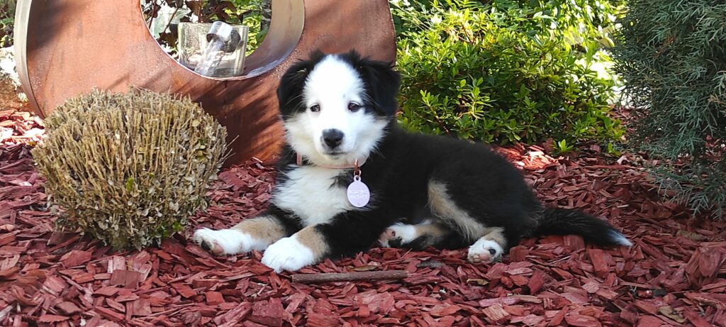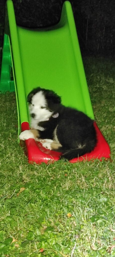 Lola est notre petite dernière arrivée à la maison le 20 septembre 2023, c’est une belle chienne berger américain miniature. Elle est née, le 18 juillet 2023 sous le nom d’Utopie au Domaine d’Andilly en haute-marne chez Cécile LEURET et sa famille. C’est une petite tricolore mismark car elle a la tête blanche, c’est ce qui a de suite attiré le regard de Christelle. Après plusieurs années à m’opposer à l’acquisition d’un chiot, j’ai flanché. Aujourd’hui je suis gaga de notre boule de poil aux dents aiguisées.