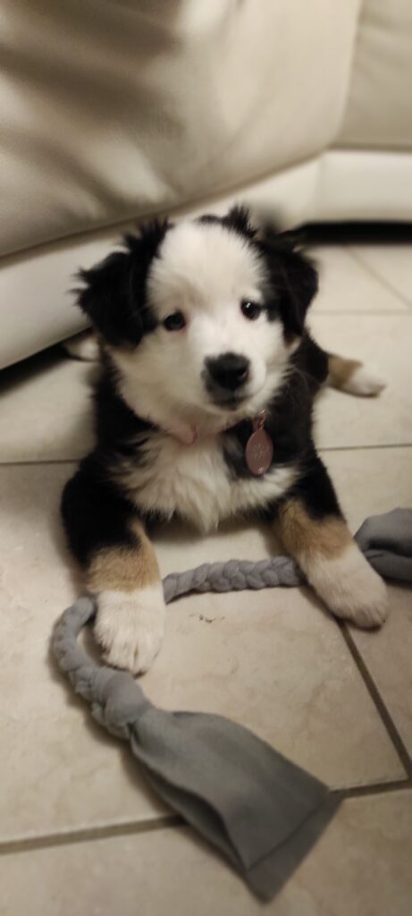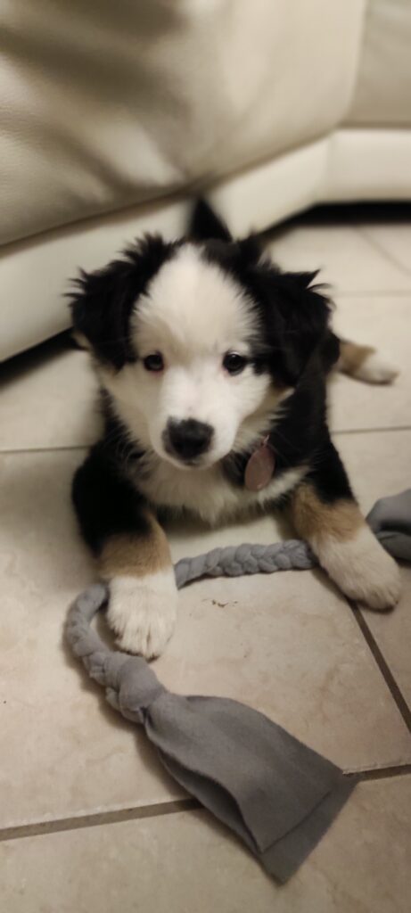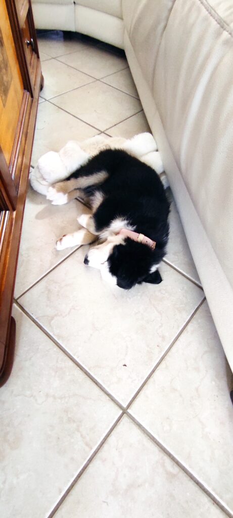 La nuit s’est relativement bien passée, grâce aux objets imprégnés des odeurs de sa fratrie, après une dernière pose pipi dans le jardin à 23h, elle nous a laissé jusqu’à 3h30 avant de réclamer à sortir. Aussitôt dit, aussitôt fait le gazon a été copieusement amendé avant une séquence jeux. Le réveil a été quelque peu difficile ensuite pour nous.