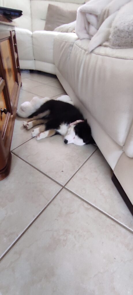 Lola rêvant quelques heures après son arrivée, c’est bon signe. Elle préfère dormir par terre au frais que dans son lit tout neuf, heureusement le sol chauffera cet hiver. Son lit ne lui sert que pour jouer.